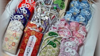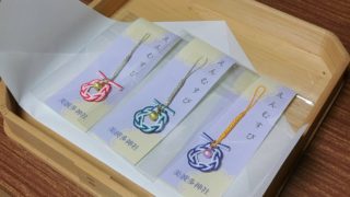ここでは美波多神社の水引守の紹介をしています。一つ一つ宮司手づくりです。