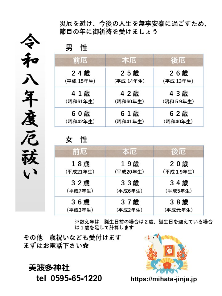 令和八年度厄除祈願について